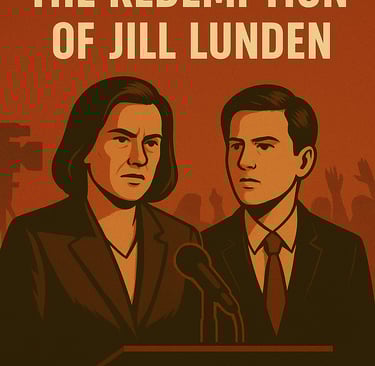 Jill Lunden’s story begins with exile. Once a trusted Democratic leader, she was cast aside after refusing to “fall on the sword” for President Charles Sport — the man under whose administration she relied on falsified intelligence to justify a brutal, years-long war in Botswana. The war ended in devastation, with reports of a nuclear detonation and mass casualties. Though Jill faced ten separate investigations, she was never indicted. Yet public opinion — and her party — condemned her all the same.