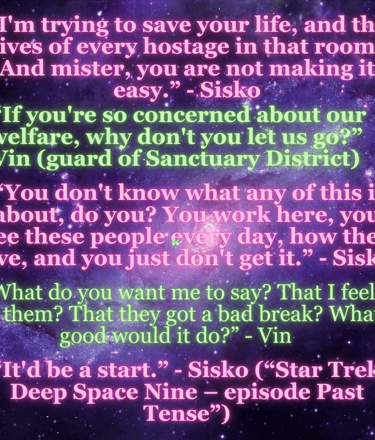 To us, "Past Tense" is an episode that transcends the boundaries of science fiction. It vividly paints a dark future and serves as a stark warning of the dangers of societal indifference and the consequences of neglecting our most vulnerable populations. The depiction of Sanctuary Districts in this Star Trek: Deep Space Nine episode presents a harrowing vision of what could happen if we fail to address the pressing issues of poverty, homelessness, and unemployment.